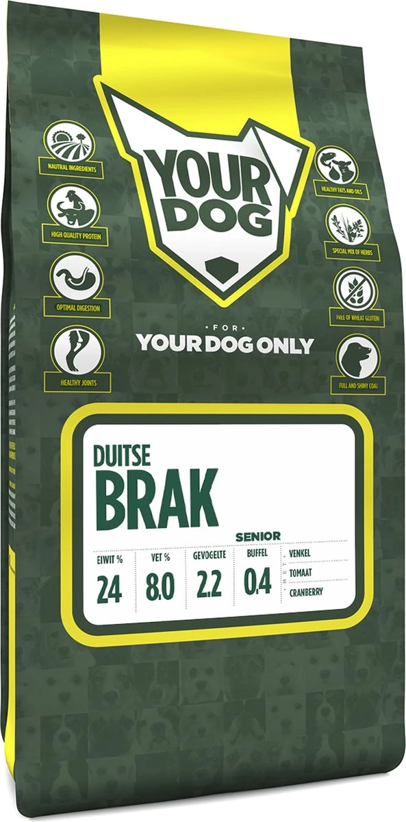 Yourdog Duitse brak Hondenvoer | Senior | 3KG, Yourdog Duitse brak zorgt voor de holistische gezondheid en het welzijn van jouw hond. Alle Yourdog varianten bevatten smaakvolle buffel en kip. Wij combineren dit met zorgvuldig geselecteerde groenten, fruit en kruiden om zo te komen tot de perfecte voeding voor jouw Duitse brak. Waarom Yourdog Duitse brak, Rijk aan buffel en gevogelte, Speciaal gemaakt voor de Duitse brak, Bevat Venkel, Tomaat en Cranberry, Bevordert een gezonde, glanzende vacht, Behoud een gezonde darmflora, Vrij van kunstmatige geur-, kleur- of smaakstoffen, Ook geschikt voor de gevoelige Duitse brak, Onze ingrediënten, Voor het maken van ons voer wordt er voor een 12 kg-zak 10,6 kg vlees ingedroogd, zodat dit beter te verwerken is in onze brok. Met de juiste hoeveelheid groente, fruit en kruiden is Yourdog een gezonde, voedzame keuze voor de hond. Buffel, Bij Yourdog gebruiken wij vlees van vrij opgegroeide en gras gevoerde buffels. Buffelvlees staat bekend om zijn romige, frisse smaak en rijke kleur en zit vol met vitaminen en mineralen. Met een lager cholesterol- en vetgehalte en minder calorieën zit dit malse vlees bomvol gezondheidsvoordelen. Gevogelte, Bij Yourdog maken wij gebruik van eend, kip en kalkoen welke samen zorgen voor een heerlijke smaak en aroma van de brok. De hoog verteerbare eiwitten in het gevogelte zorgen voor een goede spieropbouw en zijn rijk aan vitaminen en mineralen. Groente, Om de hond te voorzien van extra waardevolle voedingsstoffen zijn supergezonde groenten aan ons voer toegevoegd. Zo zijn groenten niet alleen voedzaam, maar hebben ze ook nog andere gezonde eigenschappen. De ruwe vezel in groenten is goed voor de darmen en kan onder andere bijdragen aan de spijsvertering. Fruit, Wij voegen een unieke combinatie van fruit toe aan Yourdog, waardoor de hond alle essentiële, natuurlijke antioxidanten binnen krijgt. Zo kan fruit goed zijn voor het immuunsysteem van de hond, maar het kan ook bijdragen aan een frisse adem of het behouden van een gezonde spijsvertering. Deze natuurlijke ingrediënten bevorderen de gezondheid van de hond. Kruiden, De gezonde kruiden die ons voer verrijken zijn afkomstig van planten uit Europa. Het gebruik van onder andere kruiden, wortels, bloemen, planten en wieren vindt zijn oorsprong al duizenden jaren terug. Deze ingrediënten ondersteunen de natuurlijke processen in het lichaam van de hond, zoals de spijsvertering. Ieder ingrediënt dat wij aan ons hondenvoer toevoegen is met zorg geselecteerd vanwege de positieve eigenschappen. Afhankelijk van de grootte van de hond, het ras of de rasgroep worden ingrediënten extra onder de aandacht gebracht. Rasspecifieke klachten kunnen worden verminderd door het gebruik van kruiden, wortels, bloemen en planten. Duitse brak specifieke groente, kruiden en fruit, Wij hebben zorgvuldig de raseigenschappen van de Duitse brak onderzocht. Ook hebben we onderzoek gedaan naar de eigenschappen van de FCI-ras sectie en de FCI-rasgroep waar de Duitse brak toe behoort. Uit deze onderzoeken zijn, in overleg met vooraanstaande Nederlandse voedingsdeskundige, ingrediënten geselecteerd die de gezondheid en het welzijn van de Duitse brak optimaal ten goede komen. Venkel, Venkel is een plant uit de schermbloemenfamilie en is te herkennen aan de anijssmaak. De draadvormige vertakkingen van de bladeren worden vaak als kruid gebruikt en de zaden als specerij. Deze zaden staan al eeuwenlang bekend om de geneeskrachtige eigenschappen. Zoals veel kruiden en zaden, is ook venkel rijk aan verschillende vitaminen en mineralen. Zo bevat het veel vitamine A en C en de mineralen ijzer en kalium. Venkel kan door ons worden toegevoegd aan het hondenvoer omdat het de spijsvertering kan ondersteunen en een opgeblazen gevoel in de maag en darmen kan tegengaan. Het kan bijdragen aan een gezond hart- en vaatstelsel en kan een positieve invloed hebben bij gewrichtsproblemen. Ook zou venkel een frisse adem bevorderen. Tomaat, De tomaat is onderdeel van de nachtschadefamilie en is afkomstig van de tomatenplant, oorspronkelijk uit Meso-Amerika. Kleine varianten werden in Meso-Amerika gekweekt door de Azteken en de Maya’s. In 1893 werd in Amerika besloten dat de vrucht moet worden beschouwd als een groente. Bij Yourdog gebruiken wij tomaat op een culinair niveau, hierbij gaan wij uit van tomaat als groente. Tomaten zijn rijk aan voedingsstoffen, laag in calorieën en hebben een hoog oplosbaar vezelgehalte wat bijdraagt aan de spijsvertering. Zo bevat tomaat ook lycopeen, hier hebben tomaten hun rode kleur aan te danken. Hoe roder een tomaat is, des te meer lycopeen erin zit. Naast dat dit een tomaat de rode kleur geeft, staat het ook bekend als een krachtig antioxidant. Zo heeft onderzoek aangetoond dat lycopeen onder andere bescherming kan bieden tegen kanker en kan het helpen bij hart- en vaatziekten. Hiernaast bevat tomaat veel vitamine C en vitamine A- en B-complexen, dit kan bijdragen aan een gezonde huid en een verbeterd immuunsysteem. Tomaat wordt toegevoegd aan ons hondenvoer omdat dit een positieve bijdrage zou kunnen leveren aan het voorkomen van rasspecifieke klachten in relatie tot spijsvertering, huid, zicht en hart- en vaatziekten. Hiernaast kan het een algemeen zuiverende werking hebben op het lichaam. Cranberry, De cranberry is een plant uit de heidefamilie. Deze plant is in Nederland voornamelijk te vinden op de Waddeneilanden en zeer zeldzaam in de rest van Nederland. Oorspronkelijk komt de plant uit Noord-Amerika en zou deze rond 1845 voor het eerst naar Nederland zijn gekomen. Cranberries bevatten een unieke mix van voedingsstoffen die een krachtige gezondheidsboost kunnen bieden aan honden. De besjes zijn onder andere rijk aan mineralen zoals kalium, die zorgt voor een gezond niveau van de vitale vloeistoffen in het lichaam. Ook zitten deze besjes vol met vitamine A, B en C en antioxidanten om het immuunsysteem te ondersteunen. Vitamine C maakt de urine zuurder wat ervoor zorgt dat het